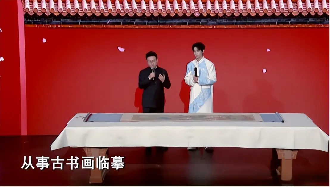 魏晨的这段演唱,其实是为了引出故宫博物院的旧字画摹仿职责。