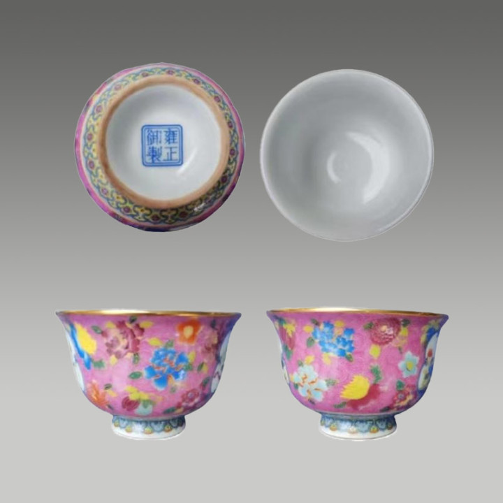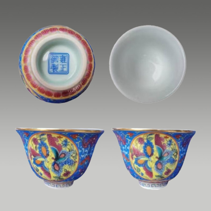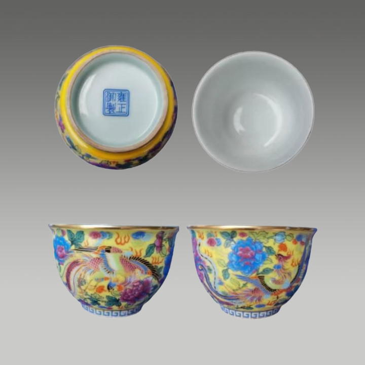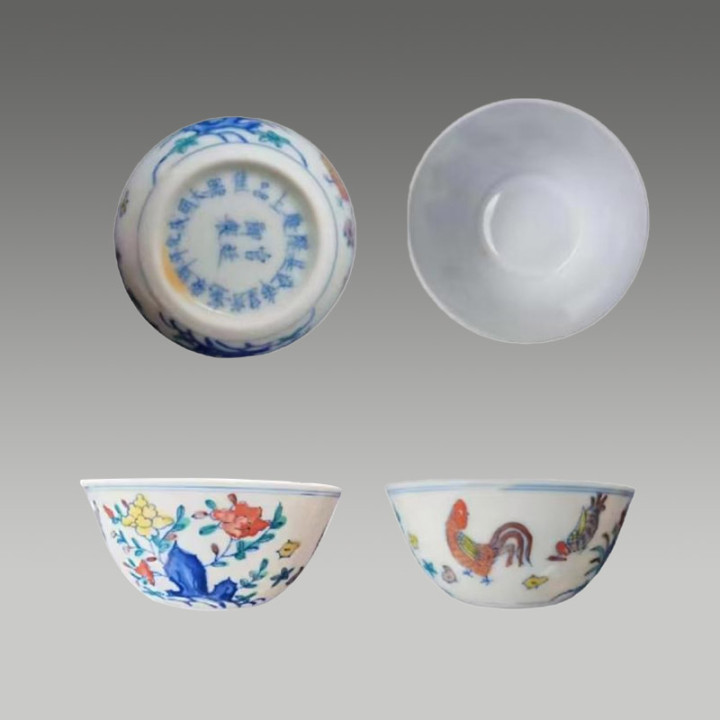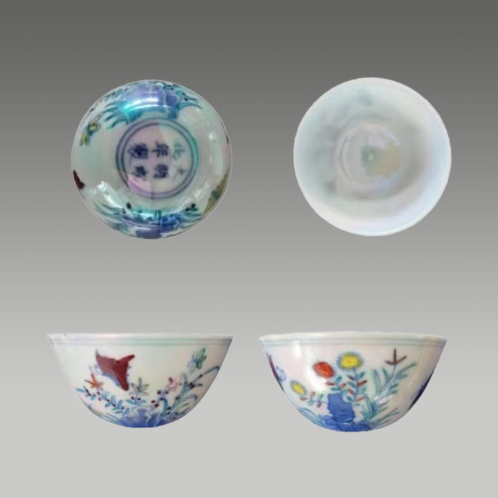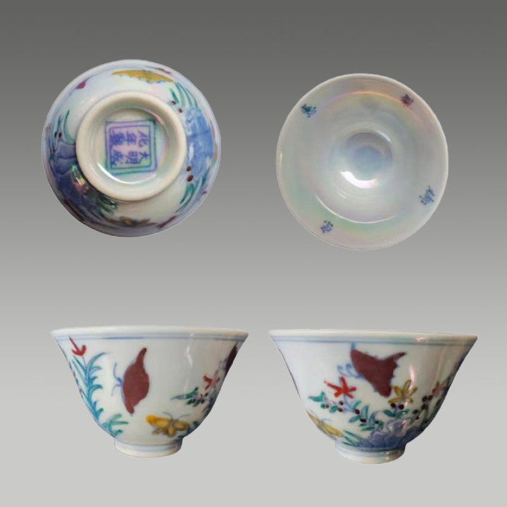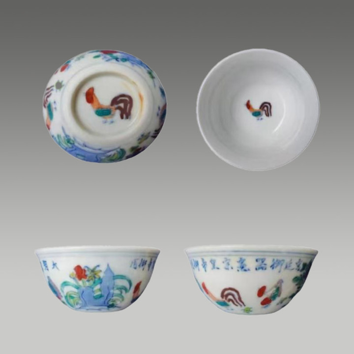 这套斗彩碗络续了斗彩工艺,以青花勾画综合,再填绘红、绿、黄等色调,二次入窑烧成