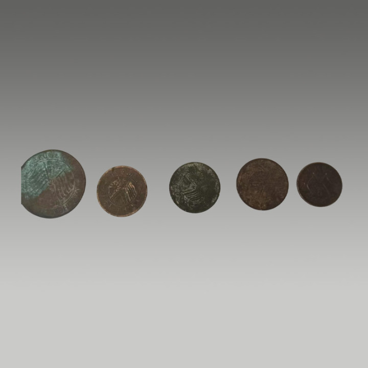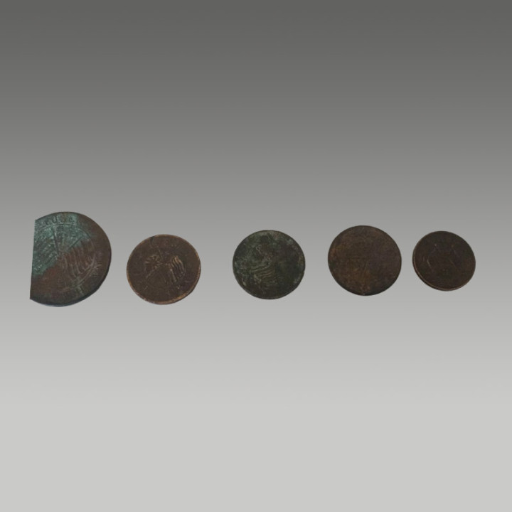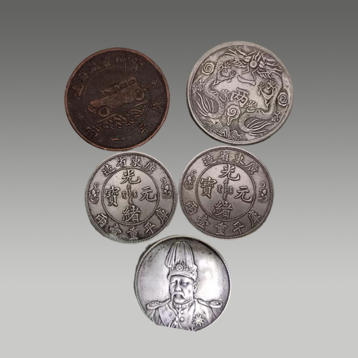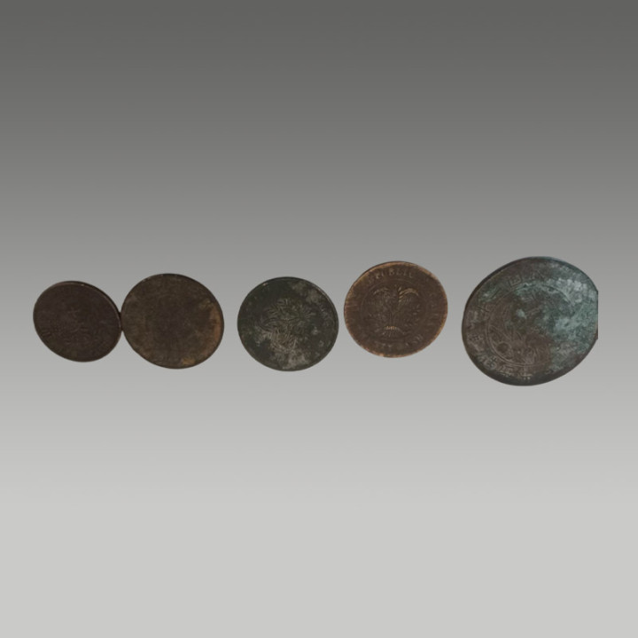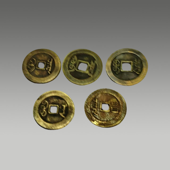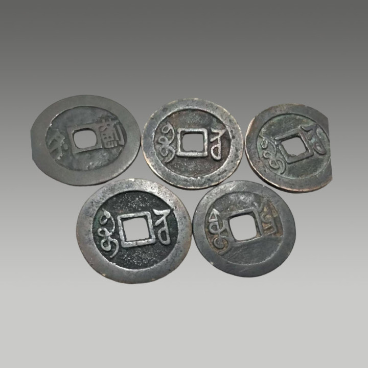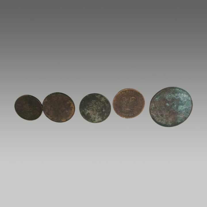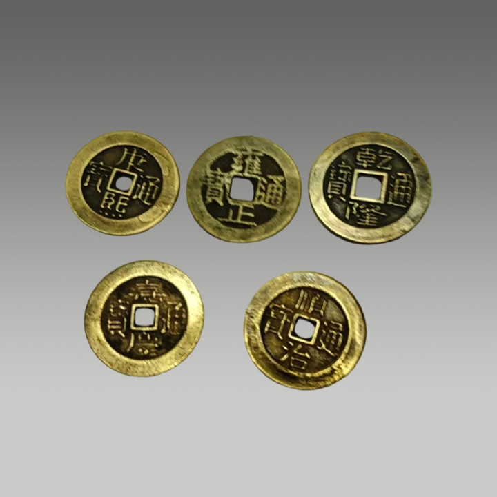 这五枚古钱币制造工艺精粹,币面图案明晰,锈色及包浆当然,因存世量有限,具有一定的商场价值