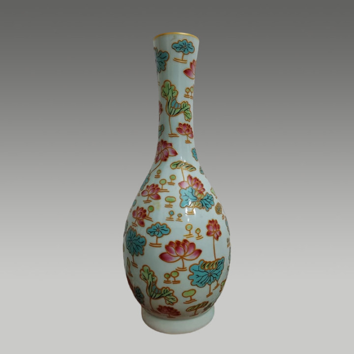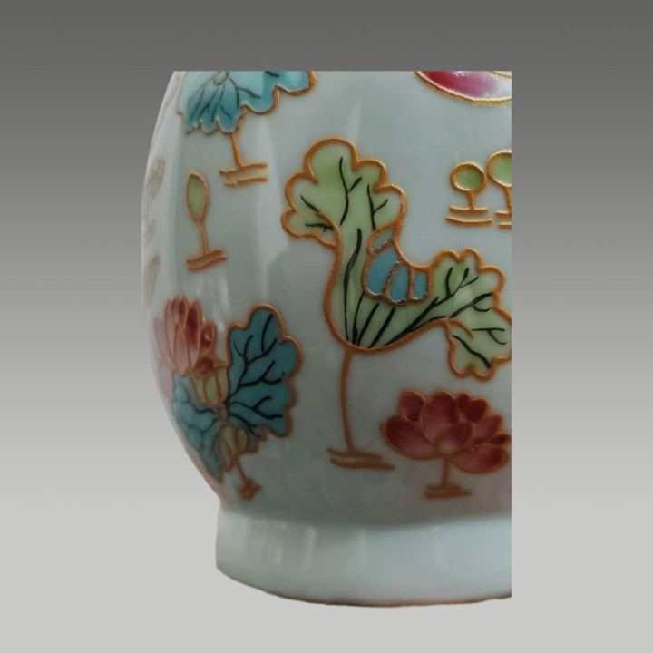 此瓶以粉彩绘荷莲,描金勾线,色调明丽好意思丽,兼具覆盖性与工艺价值,是颇具保藏后劲的艺术瓷品