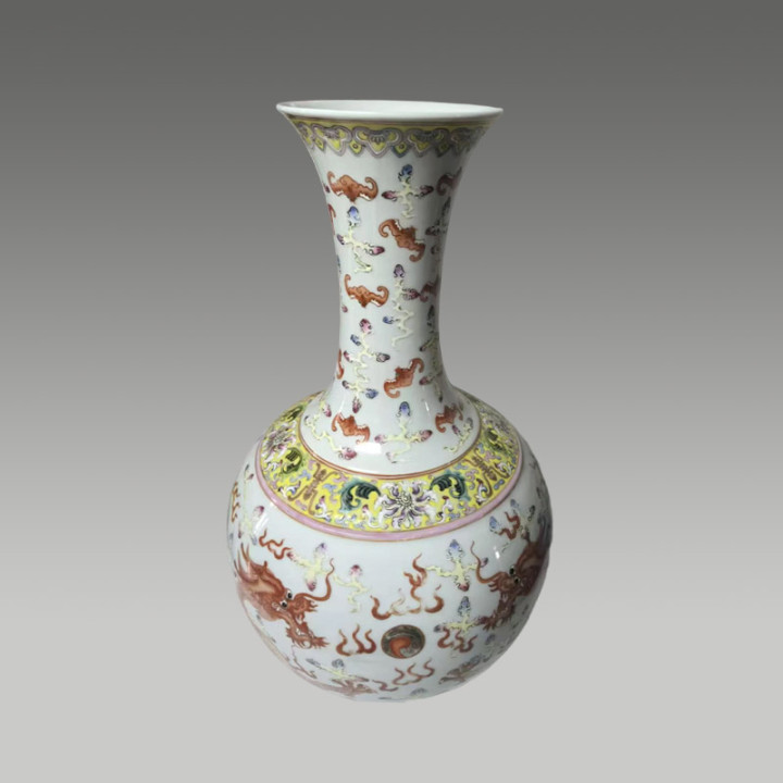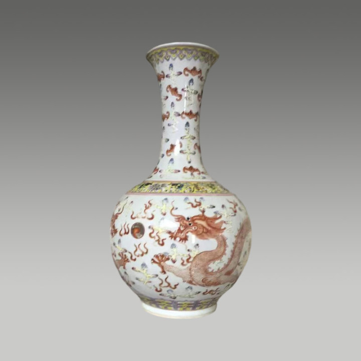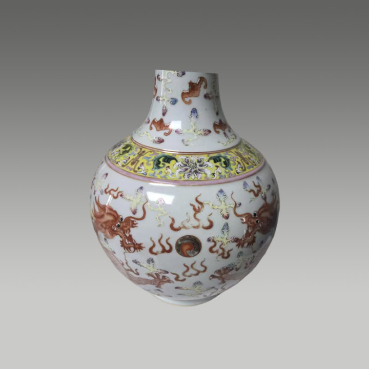 天球粉彩双龙戏珠赏瓶,以矾红描金绘双龙腾云,色调美艳,器型挺拔,彰显威仪,存世少量