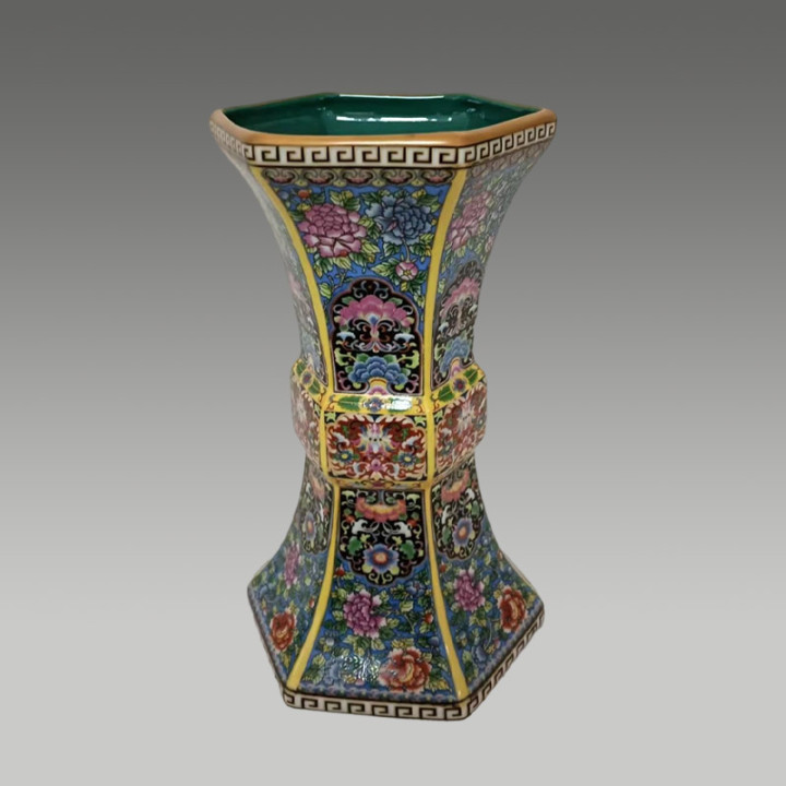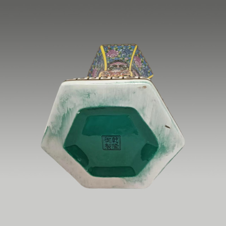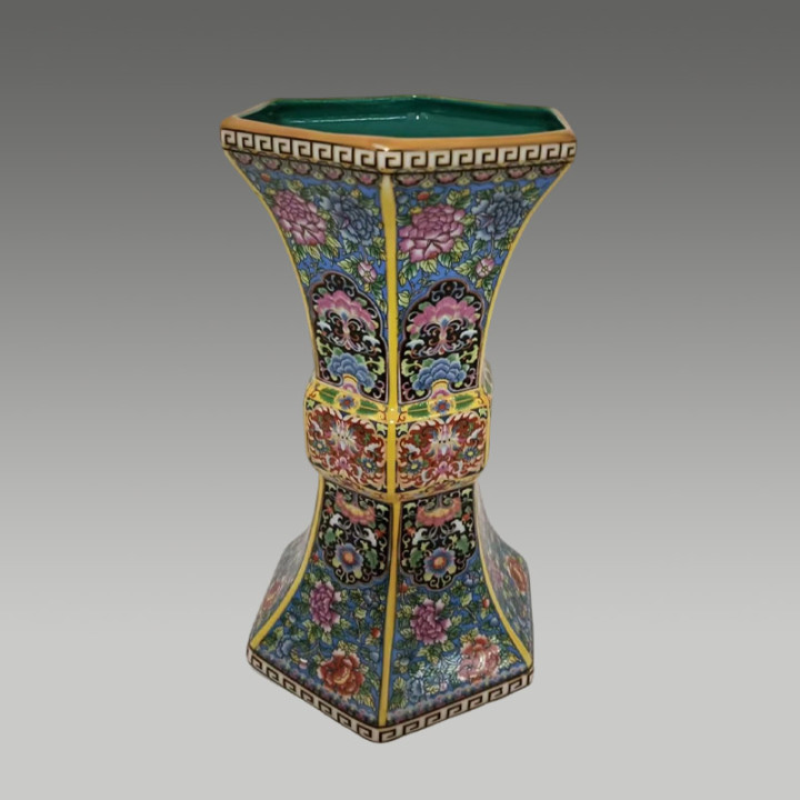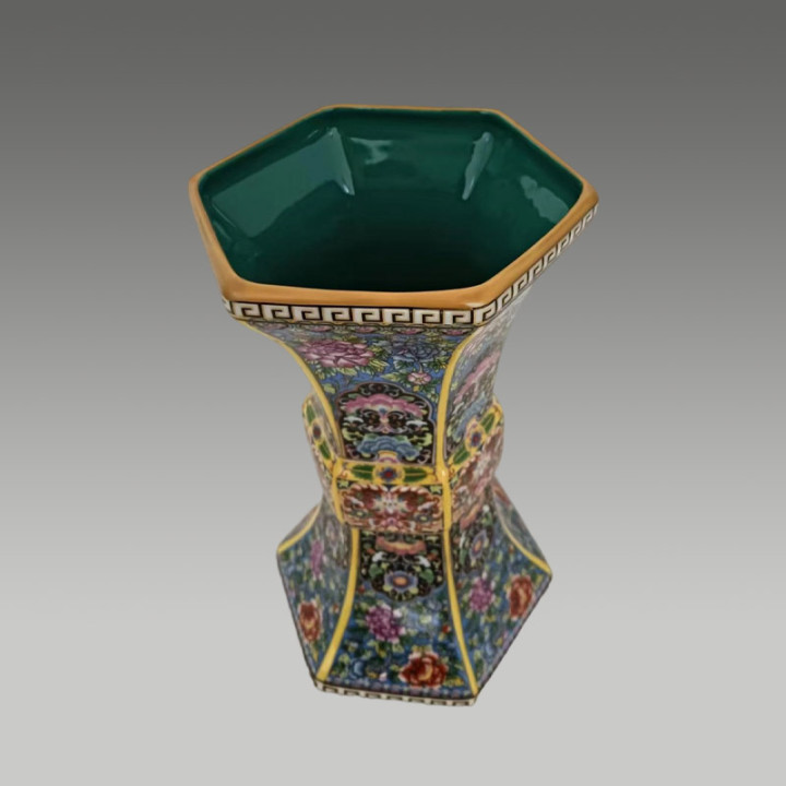 六方束腰造型规整,搪瓷彩百花繁复荣华,存世罕见,保藏价值极高