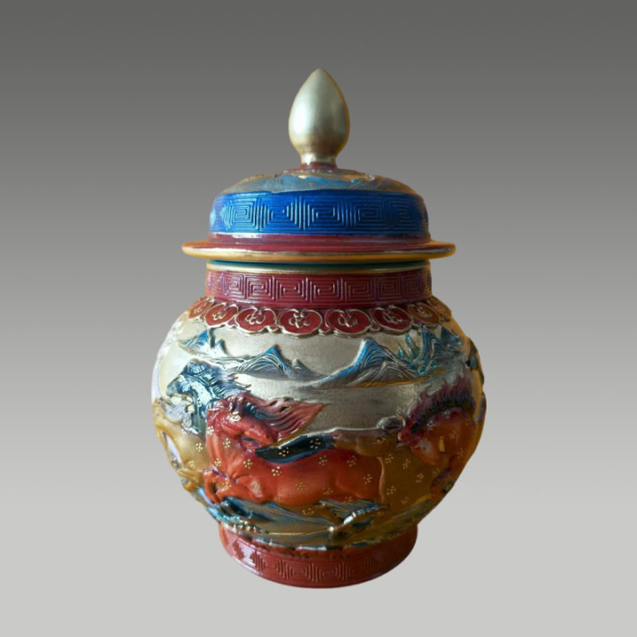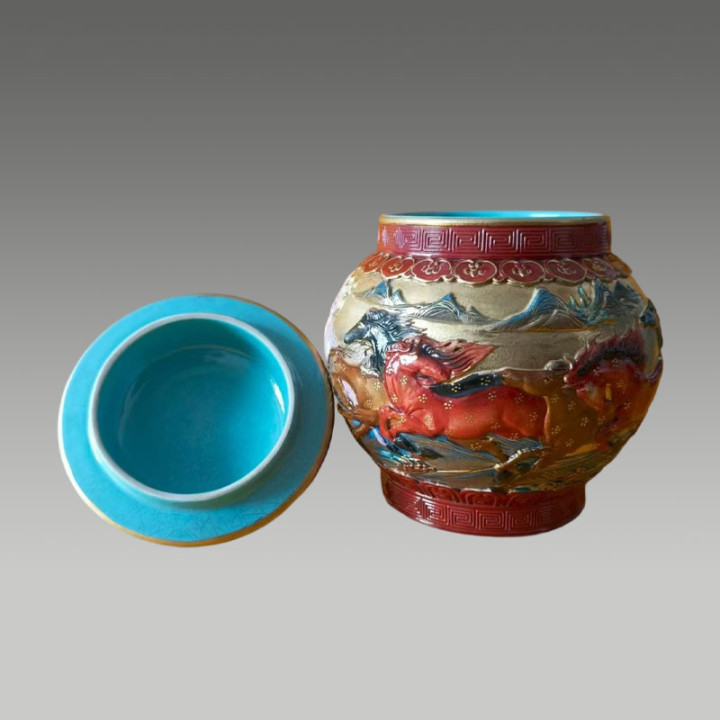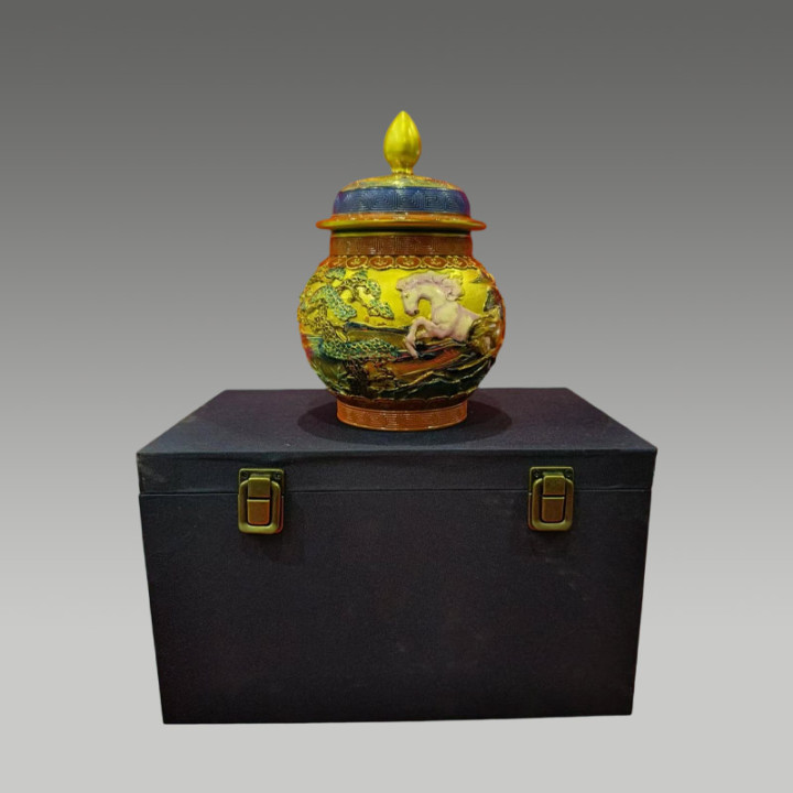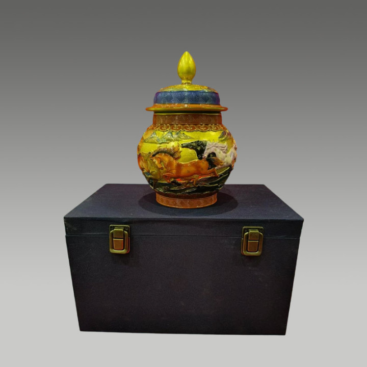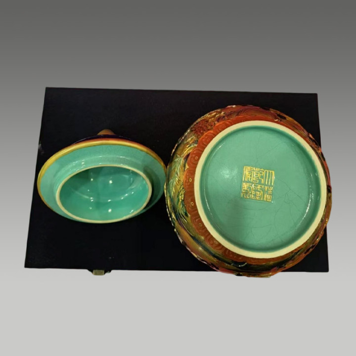 藏品通过高温烧制使釉料当然流动,变成蓝,绿,红,褐等交汇斑驳色调,存世量极度少