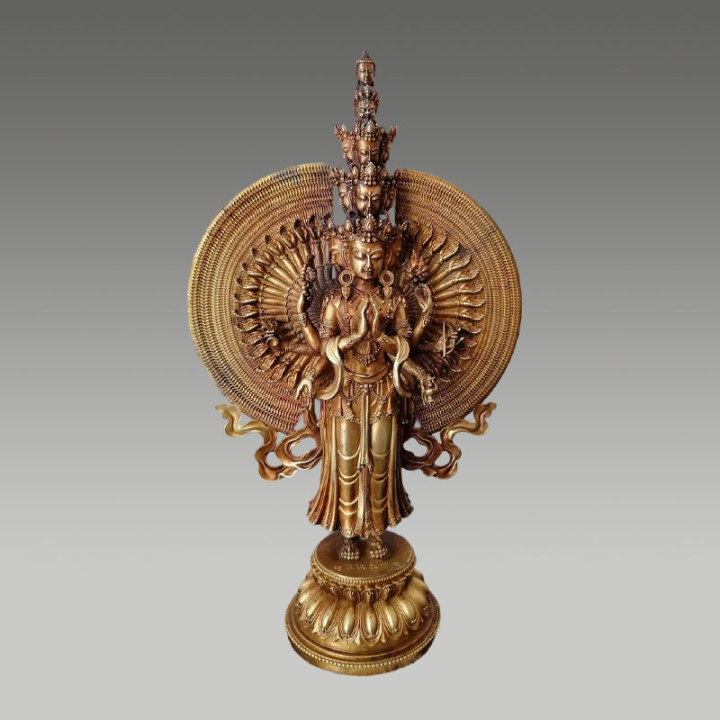 此尊为铜鎏金工艺,举座造型尊严丽都,莲瓣底座填塞规整,具有很高的商场价值
