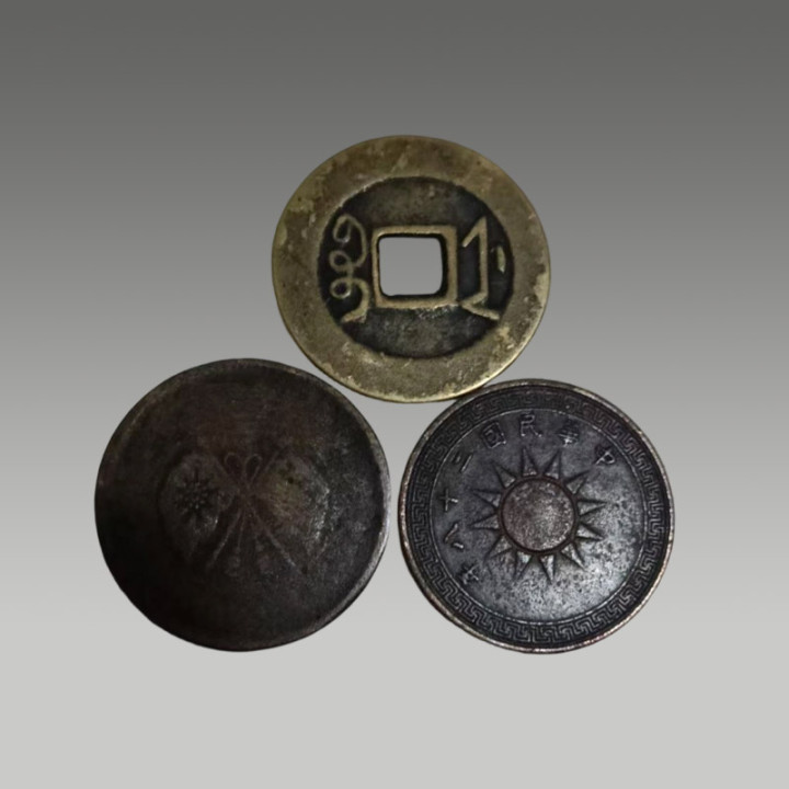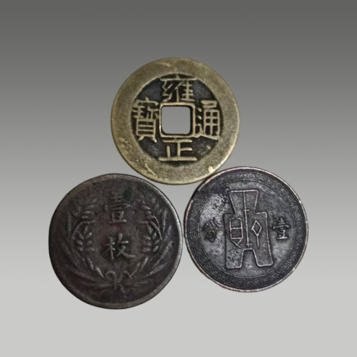 这三枚古钱币制造工艺精粹,币面图案明晰,锈色及包浆当然,因存世量有限,具有一定的商场价值