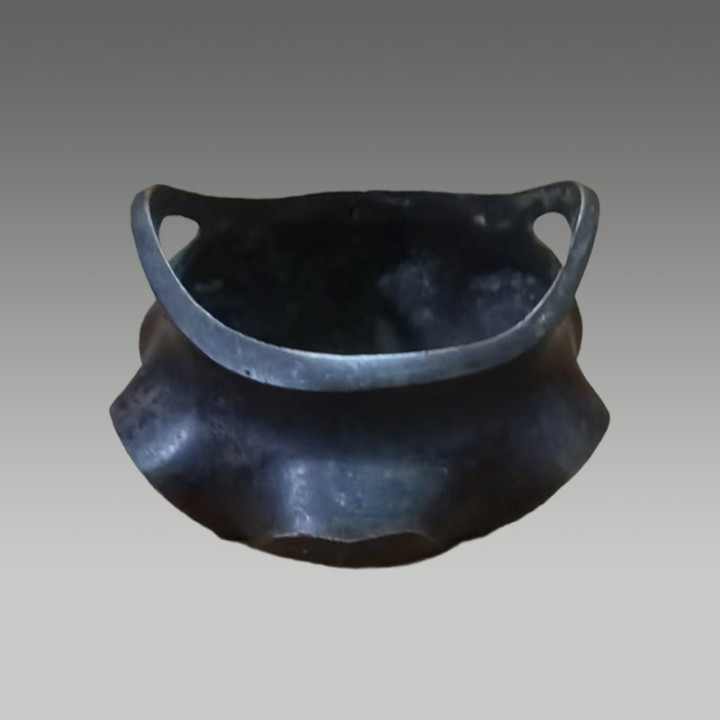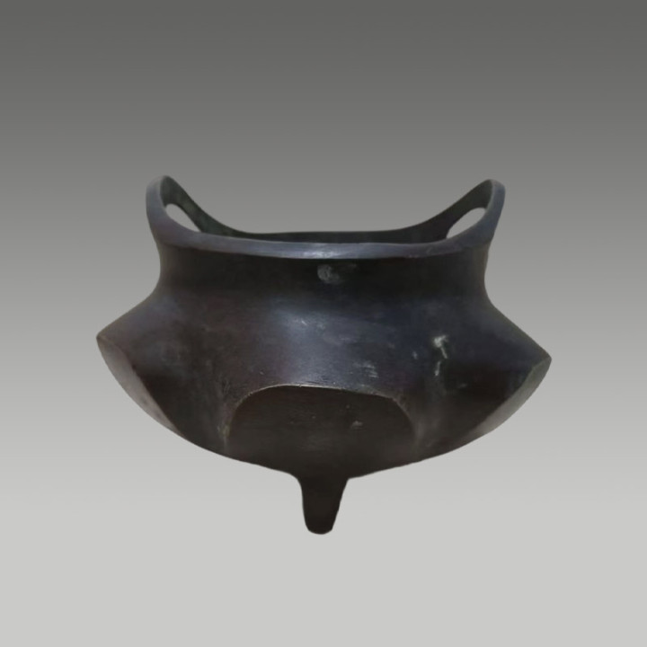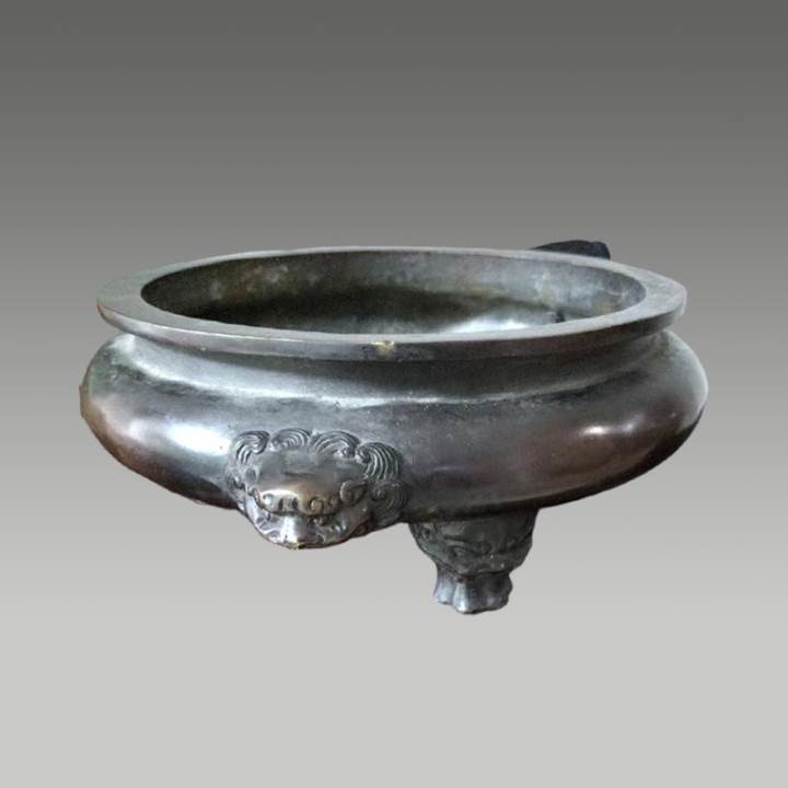 炉身两侧的狮首耳和底部的兽面三足体现了镇宅辟邪的寓意,包浆当然,有很高的保藏价值