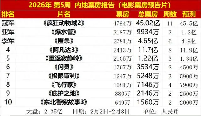 2月2日至8日的2026年第5周内地票房榜极新出炉,大盘拿下2.35亿,而上映75天的《苟且动物城2》依旧霸榜,单周狂揽...