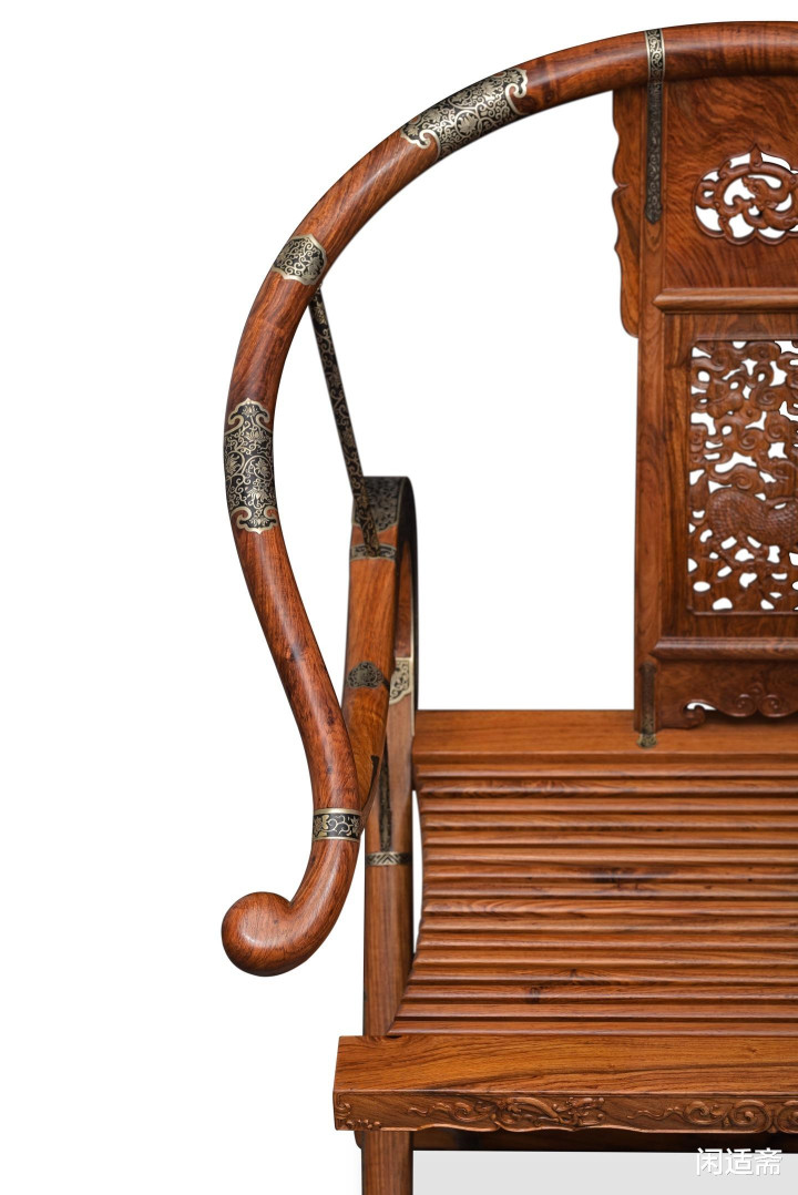 全椅铜活均为手工定制,浅浮雕卷草纹萦绕其上,工艺深湛雅致,与靠背雕纹山鸣谷应。这些铜件不仅自由加固了榫卯节点,防范结构松动,延伸器物使用寿命,更以金属的温润明后与黄花梨的木质肌理造成好意思妙碰撞,成为整件产品的点睛之饰,添一份端淑魄力。