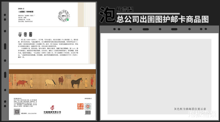 其实此次护邮卡的践诺与年册中的先容页险些调换,相通包含了总公司小智力进口、邮票基本信息以及邮票主题配景先容,独一不同的是增多了《出圉图》原绘制案,连年册先容页的践诺丰富一些。