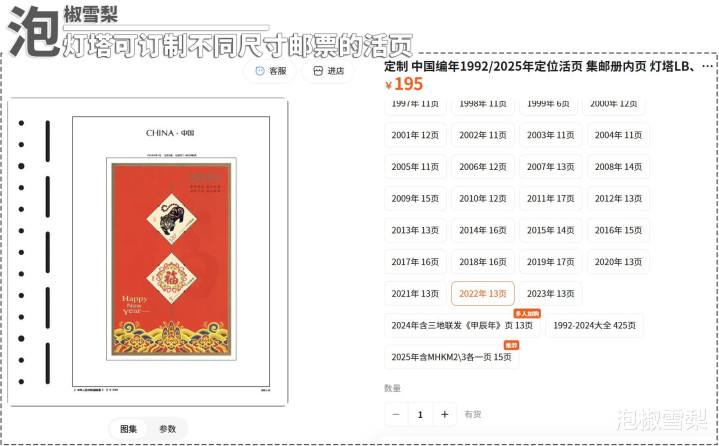 护邮卡6元1页的售价,若是按一年刊行25套邮票和3枚微型张筹算,护邮卡总价168元,其溢价率涓滴不比本票型年册低,可这种心爱哪套就买哪套的步地,又有高端高价插页的映衬,邮政背书的护邮页反而更容易让东说念主摄取。